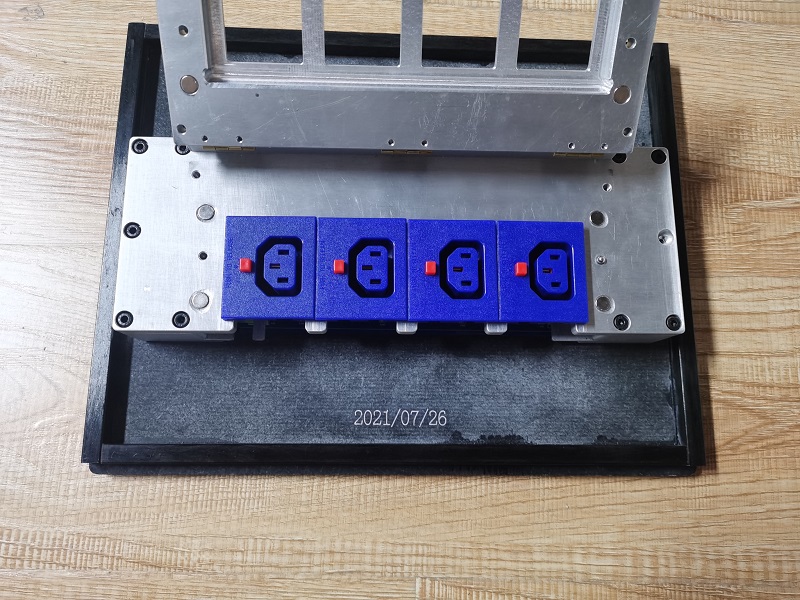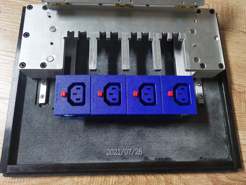 插座焊接波峰焊治具,插座焊接好后需要装配到铝合金导轨槽里面,治具需要设计抬高,定位,防止浮高,焊接好之后还需要好取出产品,浮高设计的是压盖式,焊接好后设计了直线导轨滑开,取出产品
